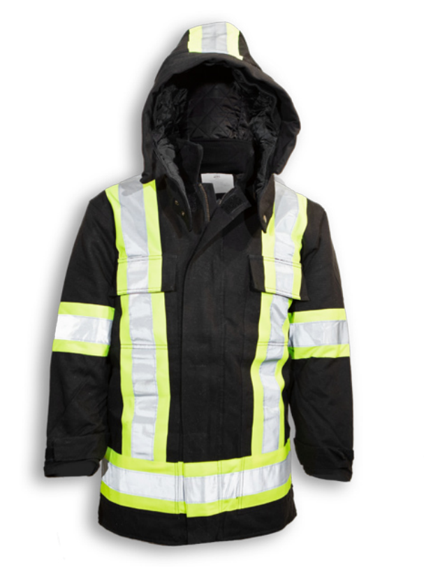 Great safety, comfort and warmth make this 100% cotton duck safety jacket a hit when the weather turns cold. It features 4 front pockets, 2 inside pockets, quilt lining, detachable hood, 8” side zippers and 4” 3M reflective tape. It meets CSA Z96-22 Class 1, Level 2 safety standards.